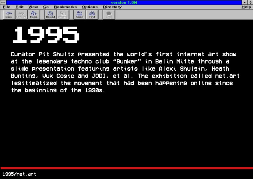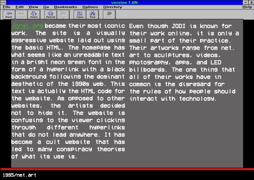 When I was attending graduate school for my master's in Visual and Critical Studies at The School of the Art Institute of Chicago (SAIC), I took an academic Art History course with James Elkins called "Writings on North Atlantic Art History and Its Alternatives." In this course we explored the lack of diversity, or rather, uniformity in the ways Art History, Criticism, and Theory are written. (He wrote a book about it if you are more interested in the subject.) As a final project, we could either propose a new way of writing about these subjects, or (as an alternative for studio artists) we could add a new section to Art History since 1900s on a movement that was not included. For reasons I cannot understand to this day, I decided to do the latter instead and created a chapter on net.art while the rest of my really smart colleagues deeply researched the subject and created innovative and thought provoking-forms of writing Art History. As an added bonus, I also decided that I cared a lot about the aesthetic this chapter would have. The document has hyperlinks that lead you to these really cool old websites (DO NOT BLAME ME IF YOUR COMPUTER GETS A VIRUS FROM THEM) and a couple of hidden ones because I liked the idea of Jim Elkins frantically clicking through the document trying to find them. You can download the document here if you are interested in experiencing it in its entirety.